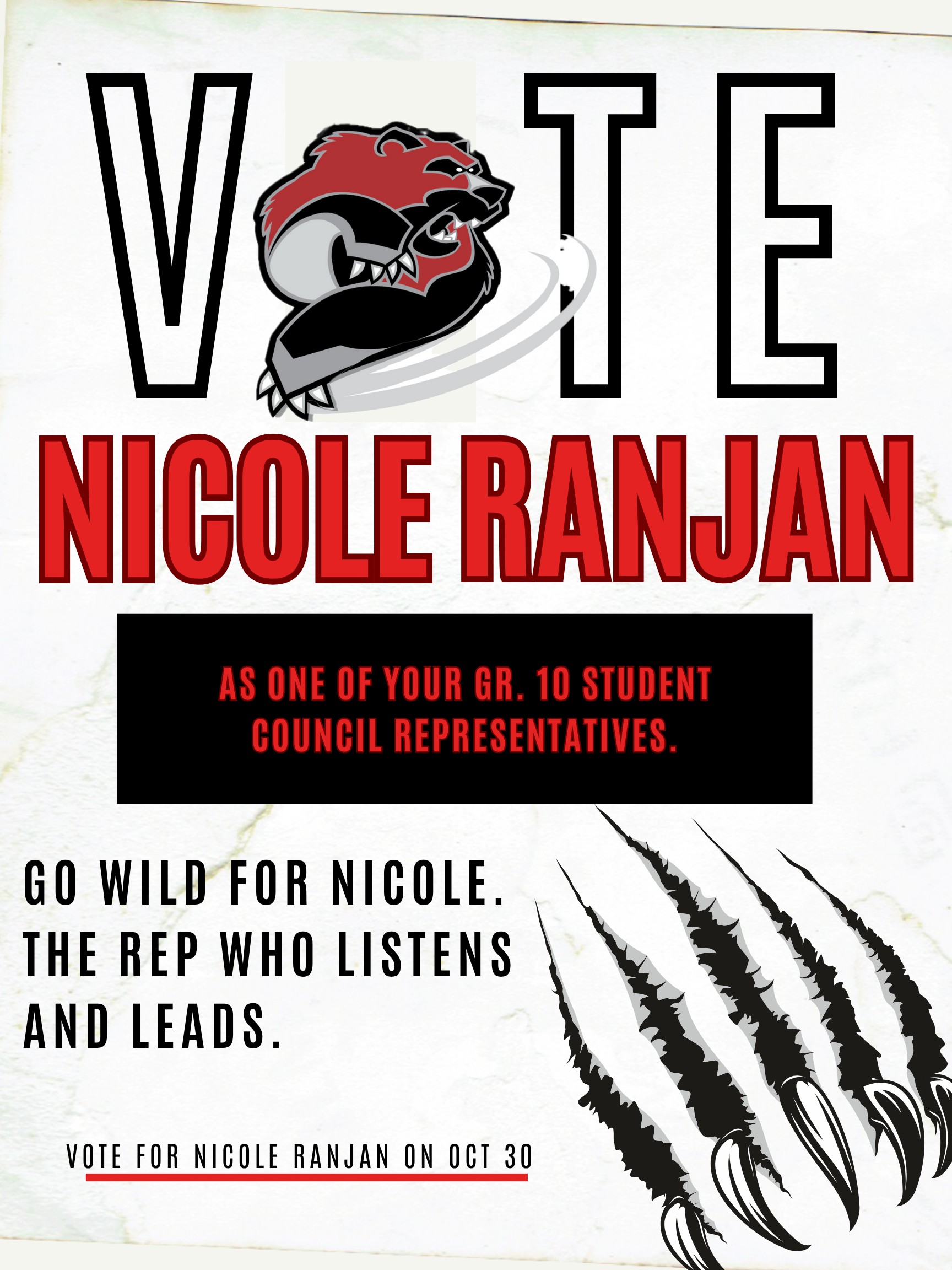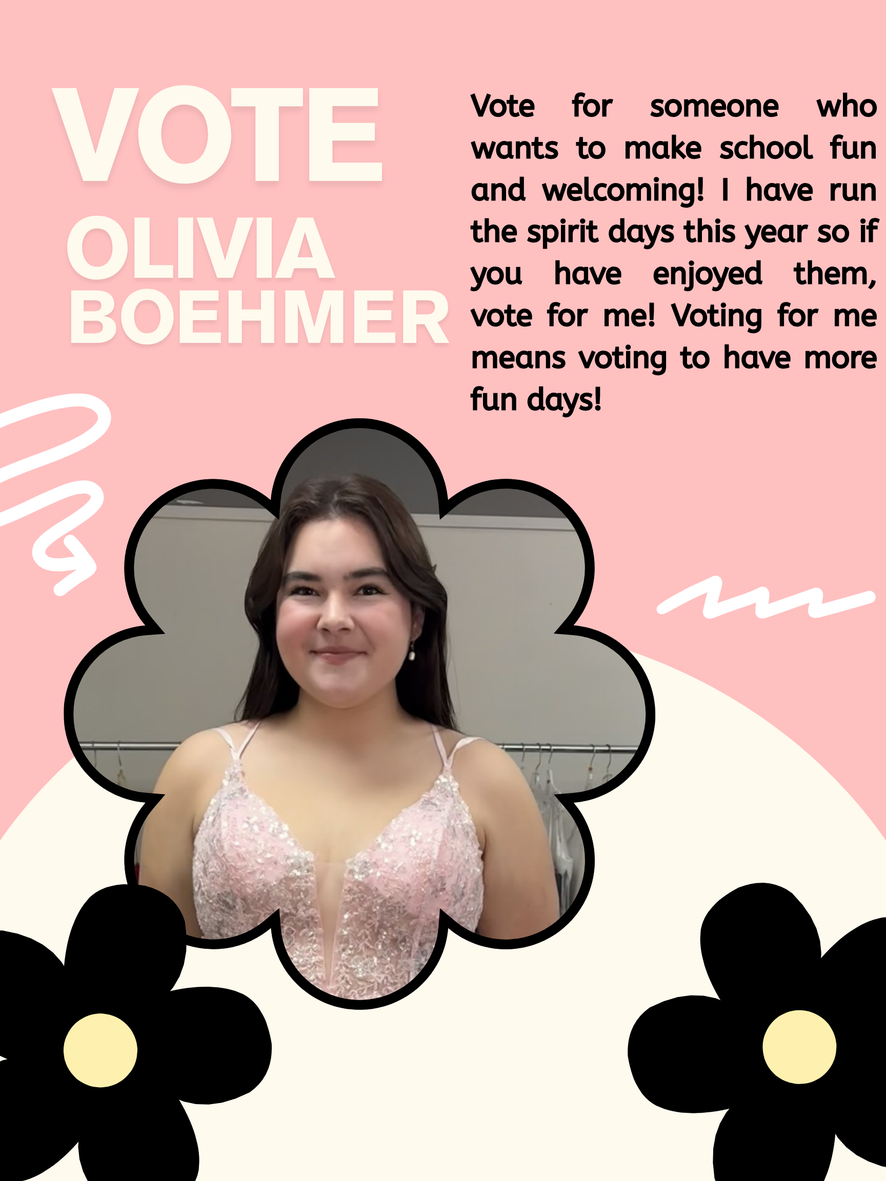 Olivia Boehmer- I am in grade 12 and I want to be part of this year’s student council! I started running the spirit days this year as part of my capstone project. I would like to do more for the school. I want to make the school a fun place where we can feel comfortable dressing up and being silly. Olivia Boehmer Poster
